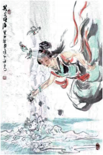 渐渐放松了警惕。有一天,女娃一边巡视一边欣赏着漳河边如画的风景,不禁陶醉其中。就在这时黑龙乘机出来兴风作浪,天空暴雨倾泻而下,脚下波涛激荡,瞬间一片汪洋。勇敢的女娃大叫一声“不好”,用尽全力与黑龙在狂风暴雨中搏斗,然而终因势单力薄,葬身海水之中。