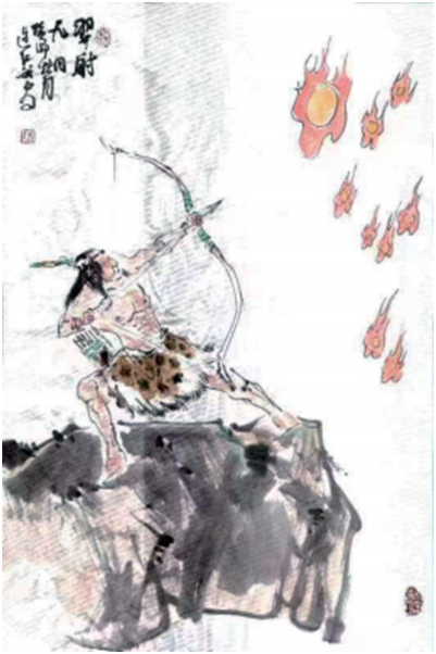 相传,在上古尧帝时代,天上有十个太阳一同出来,灼热的阳光炙烤着大地,长时间烈日当空,干旱无雨,庄稼晒焦了,花草树木在枯焦中死去,老百姓吃的食物越来越少,鬼怪巨兽开始在大地上肆虐横行,人们在死亡的边缘上苦苦挣扎着。帝尧视察灾情后,看到人民遭到了如此空前的灾难 ,心如刀割,连忙跪地向天神祈祷。天帝知道人间遭受的灾难后,便派大羿去为民除害。这大羿有一身过硬的功夫不说,还是一个神射手,箭法超群,百发百中。这一次能否拯救天下,全靠他的神射手段。