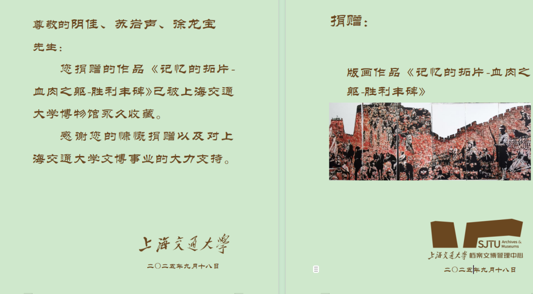 早在十年前的2015年,阴佳教授为纪念中国人民抗日战争暨世界反法西斯战争胜利70周年,耗时数月、倾力创作了这幅木刻版画作品《记忆的拓片:血肉之躯·胜利丰碑》。2015年,获上海白玉兰美术奖优秀作品奖(上海美术大展),并在中国美术馆展出;2016年,该作品被四川美术馆永久收藏;2018年,它入选上海图书馆“中华文化名人手稿馆”典藏;在2025年抗战胜利80周年之际,这幅作品被上海交通大学博物馆永久收藏,并将随《铁骨丹青·和平之盾》版画特展开启全国高校巡展。十年间,这幅画已从木刻刀痕走向国家记忆。
