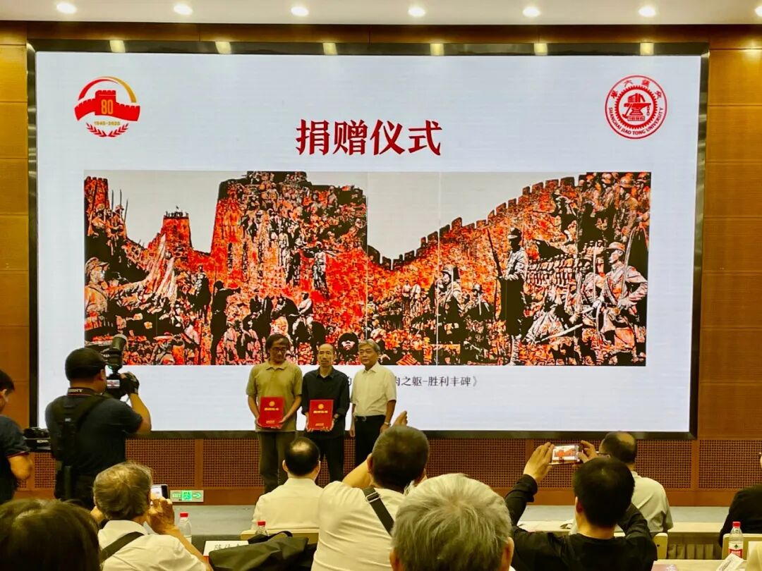 2025年9月18日上午10时,由中国工艺美术学会空间艺术专委会副主任、同济大学教授、上海济光职业技术学院设计创意学院院长阴佳、上师大美术学院苏岩声教授、上海大学上海美术学院徐龙宝教授联袂创作的巨幅木刻版画《记忆的拓片:血肉之躯·胜利丰碑》正式入藏上海交通大学博物馆,成为“纪念中国人民抗日战争暨世界反法西斯战争胜利80周年版画特展”的核心展品。作品在揭幕瞬间引发全场驻足凝视:画面中深浅交错的刀痕,似在诉说先烈的坚韧;浓淡相宜的油墨,仿佛将八十年前的烽火与今日的和平紧紧相连。这一刻,艺术不再是纸上的图像,而是跨越时空的历史对话,亦是空间艺术专委会坚守文化使命、传承红色基因的鲜活注脚。