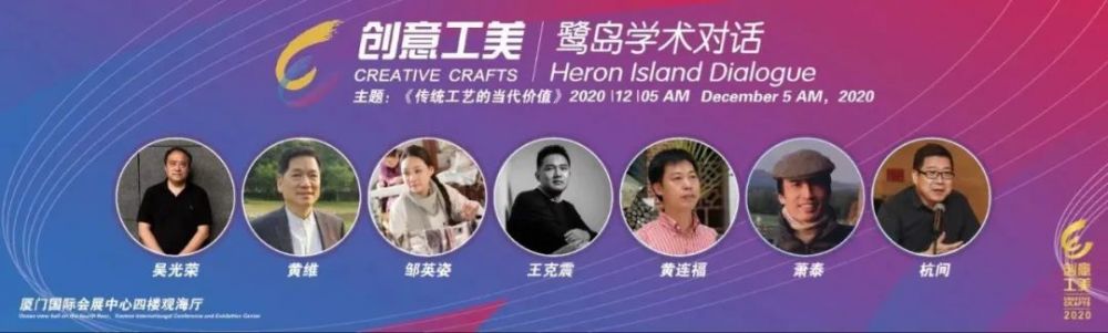 “2020创意工美——鹭岛学术对话"是第十三届海峡两岸文化产业博览交易会”2020创意工美——中国工艺美术创新作品大赛“品牌板块走向高校举办的高端学术论坛。本次论坛由5位学者发表主题演讲加一场学术对话组成,7位著名专家学者将围绕”传统工艺的当代价值“主题展开学术演讲与对话,为我们带来一场视听饕餮盛宴。