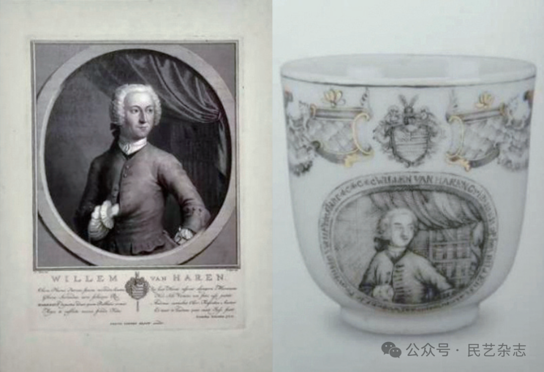 图9 威廉·范·哈伦肖像版画与广彩黑彩描金人物肖像图杯 采自上海博物馆编《中欧陶瓷与文化交流特集》