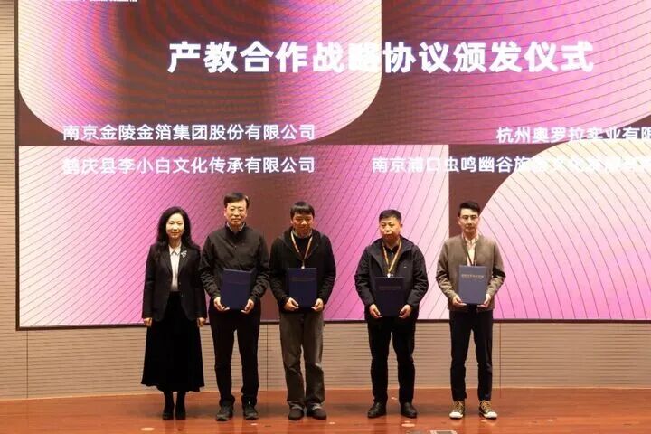 成立大会上,南京金陵金箔集团股份有限公司、杭州奥罗拉实业有限公司、鹤庆县李小白文化传承有限公司、南京浦口虫鸣幽谷旅游文化发展有限公司,四家企业正式成为专委会首批战略合作伙伴。南京艺术学院设计学院党委书记张健为上述企业颁发战略合作伙伴证书,标志着学院在推动教产融合、深化校企合作方面迈出了坚实一步。