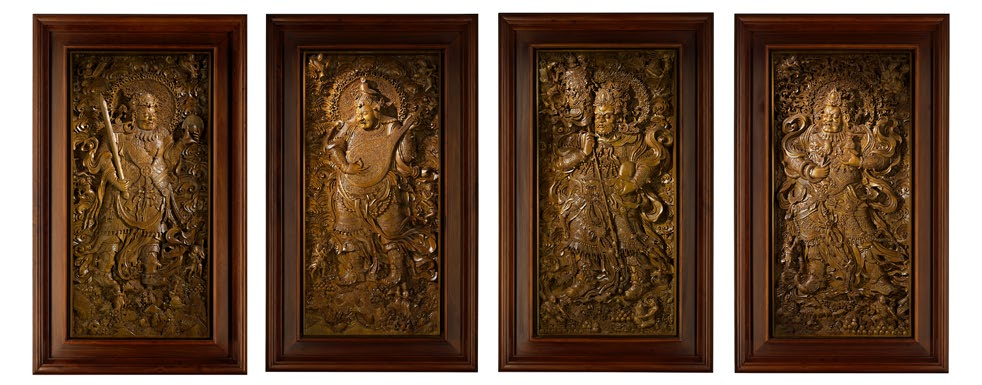 在超越性的创作题材上,黄小明同样表现出色。他在1999年时便创作出了以非洲女性与和平鸽为题材,具有超越时代与民族超现实构图风格与意味的《新世纪的呼唤》之经典作品,通过东阳木雕的语言回应全球化时代人类对和平与未来的共同期盼,将传统木雕的深厚文化底蕴、非洲女性的独特美感与20世纪末全球命运共同体的时代议题交融在一起,构成了一种超越国界与文化隔阂的人类共同情感与精神诉求。他还将各种艺术门类巧妙结合进行创作创新,如2017年时,以唐卡大师娘本的唐卡稿为画面基础,创作木雕白描稿,雕刻完成唐卡木雕作品《四大金刚》,将藏传佛教人物以木雕艺术形象展示,细腻传神地刻绘了四大金刚形象,创造了一种新型的艺术跨界,成就了木雕与藏传佛教结合的经典作品。另外,黄小明还在唐卡木雕的原色基础上,利用矿物质提取出颜料进行彩绘,使作品展现出鲜艳生动的视觉效果,他开创的矿彩画木雕工艺还申请了国家发明专利,不仅为观赏者带来别样的审美趣味与美感体验,还以木雕作品彰显出工艺跨门类的震撼融合效果,深化展现佛家文化中对人生超越境界的无限追求。此外,黄小明在2013年竣工完成的“最大的作品”——个木园,是他倾注四个春秋完成的私家园林作品。这件“作品”超越了经典木雕创作里对独立个体的塑造,而将创作着眼于空间中,融合了中国建筑学、木雕、石雕、砖雕等技艺,还融合了竹林、戏台、亭台轩榭、文化笔墨等经典园林元素,以中国传统“竹”之意象为创作与命名灵感,通过场景建设之物像,承载传统文化中的天人合一之超越性审美人生意境与天地观念。