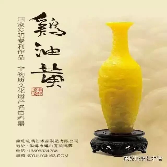 鸡油黄是瓷器釉色名的一种,因其独特的色泽和油润度而得名。应用鸡油黄的琉璃艺术品润如玉、声如磬,流光溢彩,很是精美。