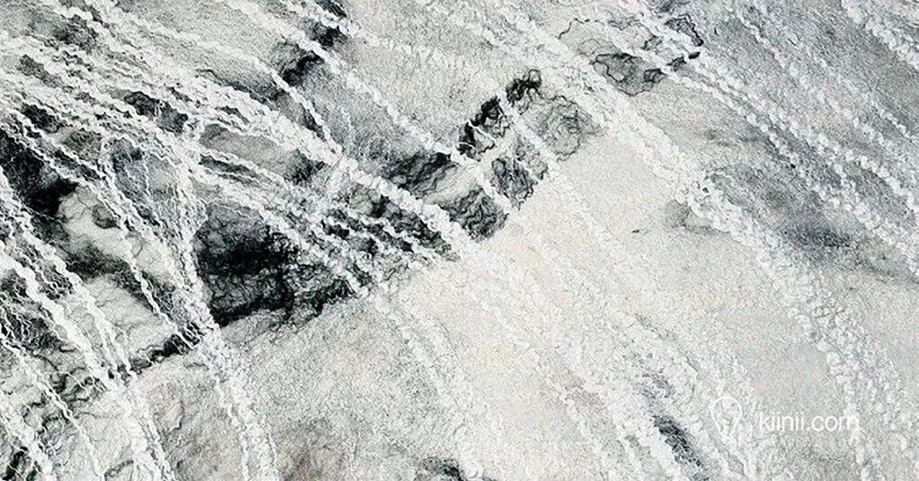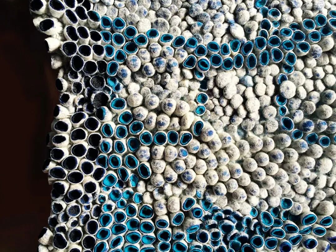 根据羊毛毡艺术作品中点状肌理的形态,笔者将它们大致分为平面的点和立体的点(由于羊毛毡的材料特性,平面的点与立体的点是相对而言的)笔者定义羊毛毡的肌理中平面的点主要通过其与周围环境的颜色区分来确定其“点”的概念。这一类型的点状肌理通常具有较强的装饰性,给人直观明了的视觉感受,同时具有羊毛毡特有的毛躁感。而立体的点主要通过其与画面周围起伏高度的区别来确定其“点”的概念。立体的点状肌理相对于平面的点状肌理而言,能给观赏者带来更大的触觉刺激。艺术家Lidwina Charpentier曾在阿纳姆的毛毡博览会上展出过他创作的一幅完全由立体的点状组成的羊毛毡艺术品。密密麻麻的点给人强烈的视觉冲击,画面以蓝、白色为主,辅以少量的黑色,不禁让人联想起北欧的极地风光。这些小石子一般凸起的点状物由白色羊毛纤维若隐若现地包裹着里层的蓝色毛毡,一部分为完整状态、另一部分为被挖空的形态,挖空的部分露出了里层的蓝色与黑色毛毡。凸起的点与挖空的点结合排布之下给作品带来一种会呼吸一般的生命活力。艺术家通过点的排布、形态、颜色所形成的特殊肌理为观者营造出了视觉、触觉、温度的多重感官体验。Jorie Johnson作品