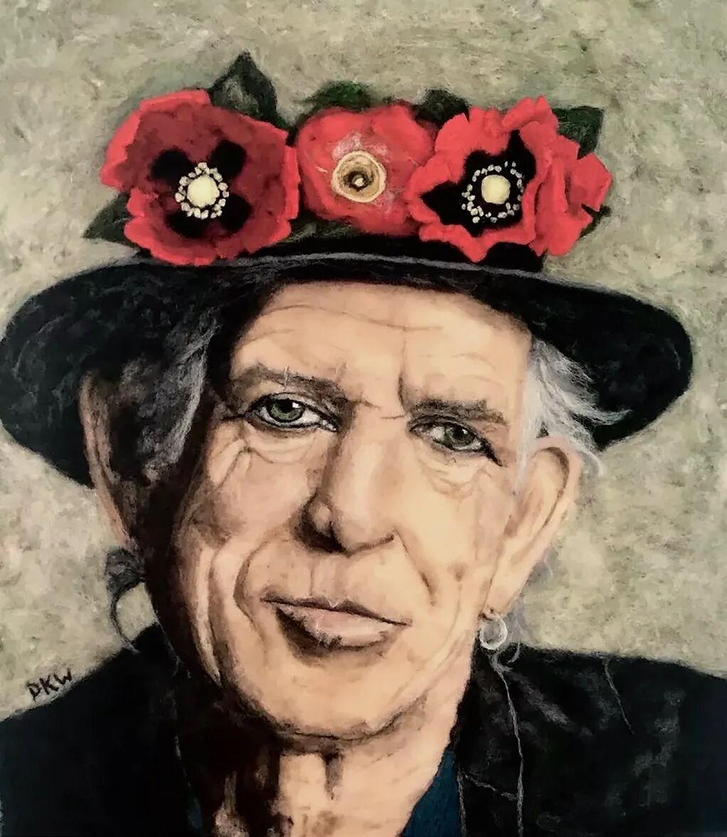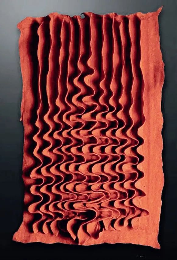 在羊毛毡艺术中,线状肌理是以多种形态存在的。它可能是一个连绵隆起的造型,也可能是一个毡片的截面,有时它是羊毛毡的形体产生的,有时它则是羊毛纤维的颜色所描绘的。同时,由于羊毛纤维本身就是一种线形材料,在羊毛毡作品中不同颜色的羊毛纤维叠加之处天然就分布着复杂交错的线状肌理。换句话说,线状肌理是羊毛毡艺术的基础肌理。根据羊毛毡艺术作品中线状肌理的形态,笔者将它大致分为平面的线和立体的线,上述的基础肌理就属于平面的线。由于毡缩效应,羊毛毡中平面的线细看之下都呈现一种波浪形,没有绝对平滑的线,这也是羊毛毡艺术的一大特色。由于羊毛纤维的特性,羊毛毡作品中平面的线通常不以坚硬、锋利的形态出现,更多的是毛糙、扭曲的线形,更加具有朴实、原始的生命气息。而立体的线状肌理在羊毛毡作品中主要是通过其与画面周围起伏高度或空间的区隔建构出来的。如图作品就是利用毡片的截面制造了立体的线状肌理。相对于平面的线,具有体积感的线使该作品更加具有触觉感官刺激。在热情洋溢的红色衬托下,立体线条上至下由平直到扭曲,从稀松到拥簇,这些有机线条产生了强烈的动态感,构成了一幅热烈活泼的画面。克拉特里克·沃特斯的针毡肖像作品