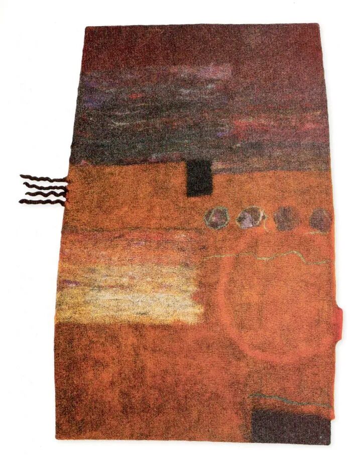 羊毛毡艺术中的面状肌理有其鲜明的视觉特征。由于羊毛毡的材料特性,羊毛毡艺术中的块面交接之处通常过渡柔和,呈现一种水彩晕染般的质感。艺术家Jorie Johnson在他的作品“View from Train Window Carpet Series:Orange Dusk”《火车窗外的橘色黄昏》中利用羊毛毡的面状肌理营造了独特的画面氛围。画面主要由橘色、浅黄色、深棕色、黑色等四种颜色的块面组成。在色彩明度相对较高的橘色、浅黄色区域布满了深色的斑点和细小纹理,而在颜色阴沉的深棕色、黑色区域则穿插着细条的白色、黄色、橘色等浅色羊毛毡纤维。亮色的部位浑浊不清,暗色的块面泛着杂光,加之画面不同的色块之间没有明确的分界线,使得整幅画面散发出一种阴郁沉重的气息,让人联想起当今被工业废气严重污染的城市和地区。俞其榕作品
