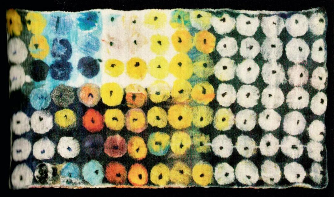 点通常给人轻快、跳跃的感觉。连续排列且大小交替变化的点,还能形成很强的节奏感和运动感。羊毛毡材料由于特有的触感属性,其点状肌理能带来不同于其他材料的心理感受。羊毛毡艺术中的点状肌理有多种形式,它们有些是毡化工艺前期就预设的,也有些是毡化完成后人为加工出来的。点状肌理在羊毛毡艺术作品中扮演着重要的角色,它以不同的数量、形状、颜色、大小以及不同的组合方式出场,影响着作品的艺术表现。羊毛毡艺术作品