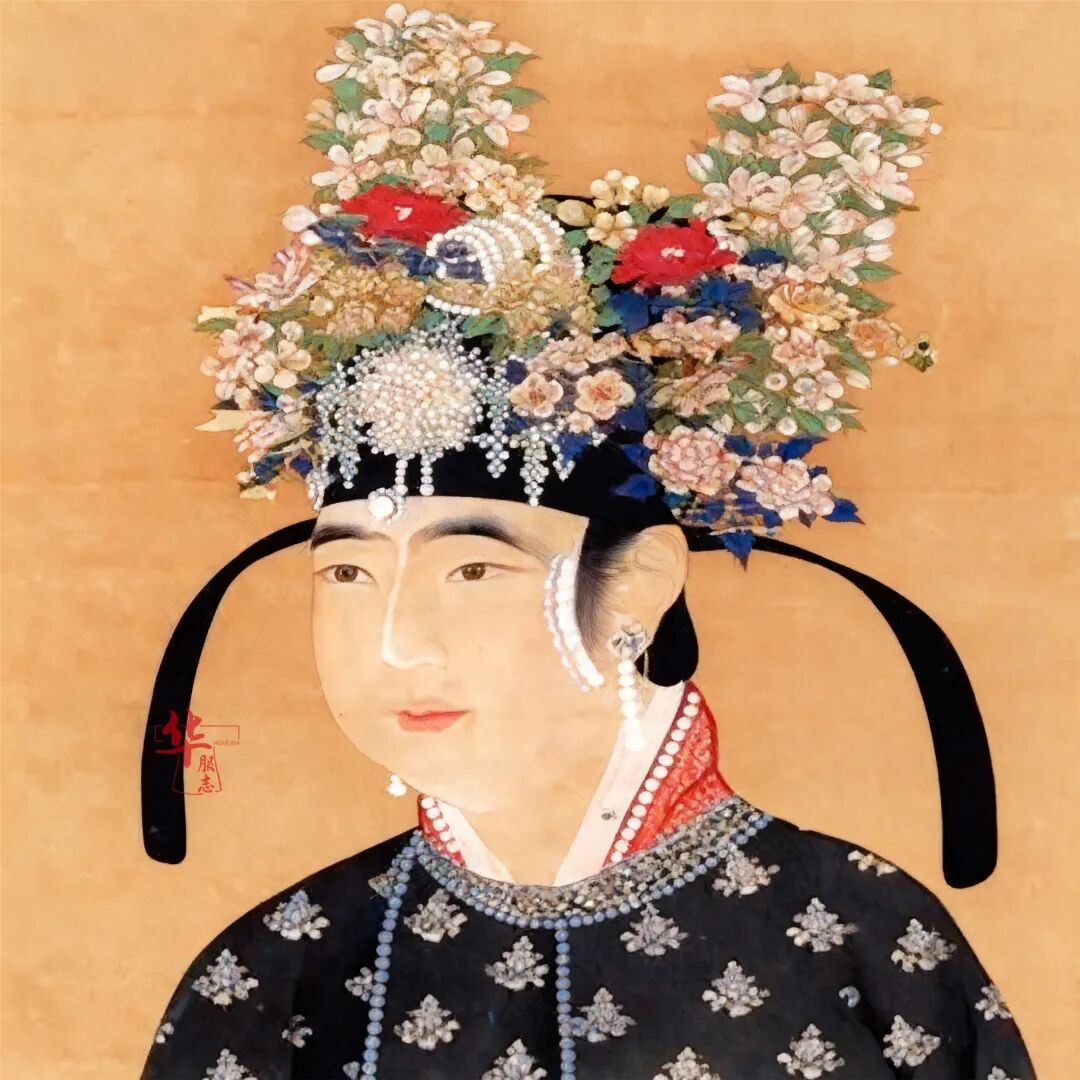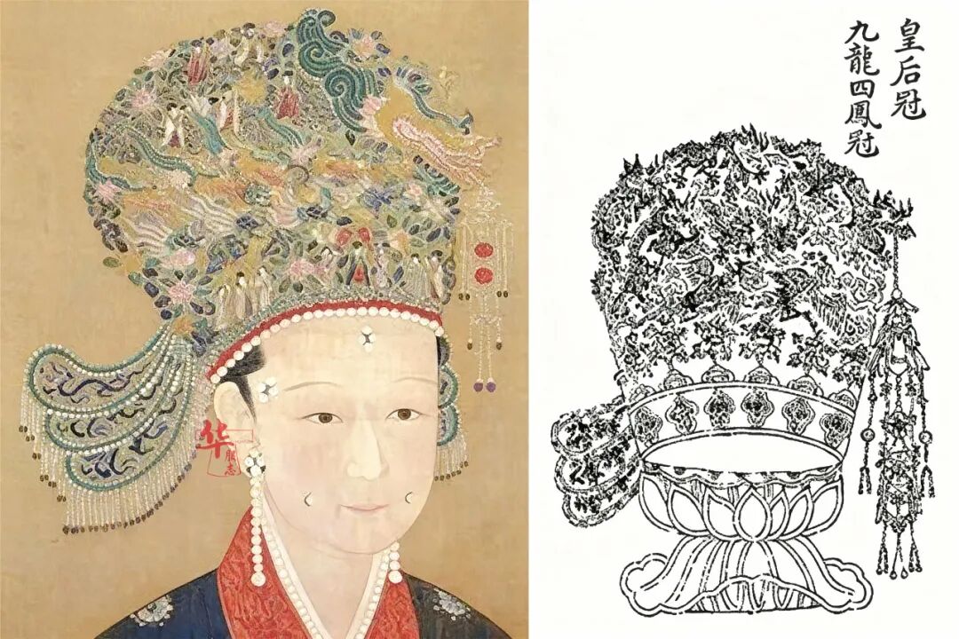 在命妇的服饰中,皇后的袆衣尤为特殊,她佩戴的是九龙四凤冠(图 1),冠上装饰有大小花枝各 12 枝,并加有左右各两博鬓。