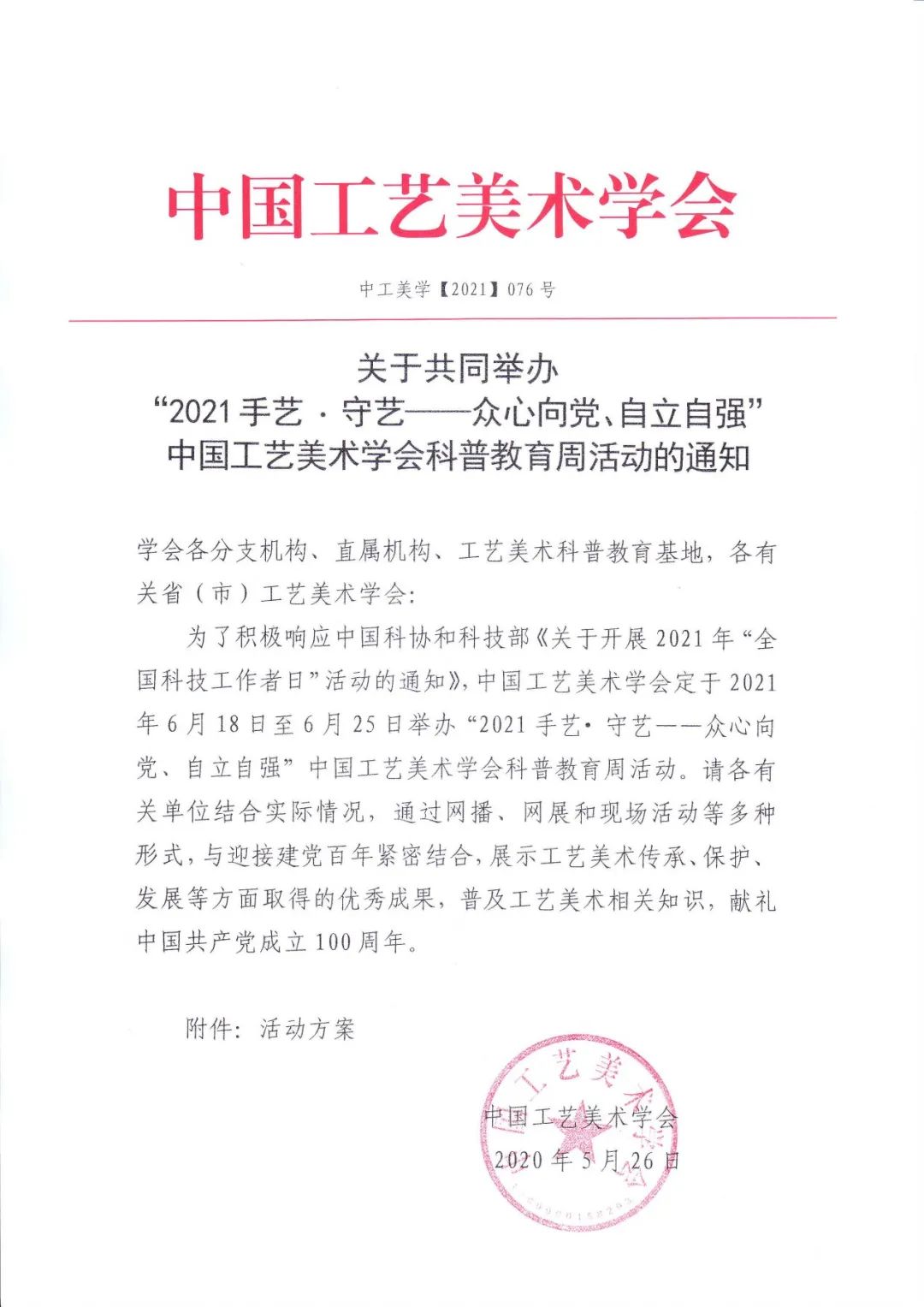 文件 | 关于共同举办“2021手艺·守艺——众心向党、自立自强”中国工艺美术学会科普教育周活动的通知