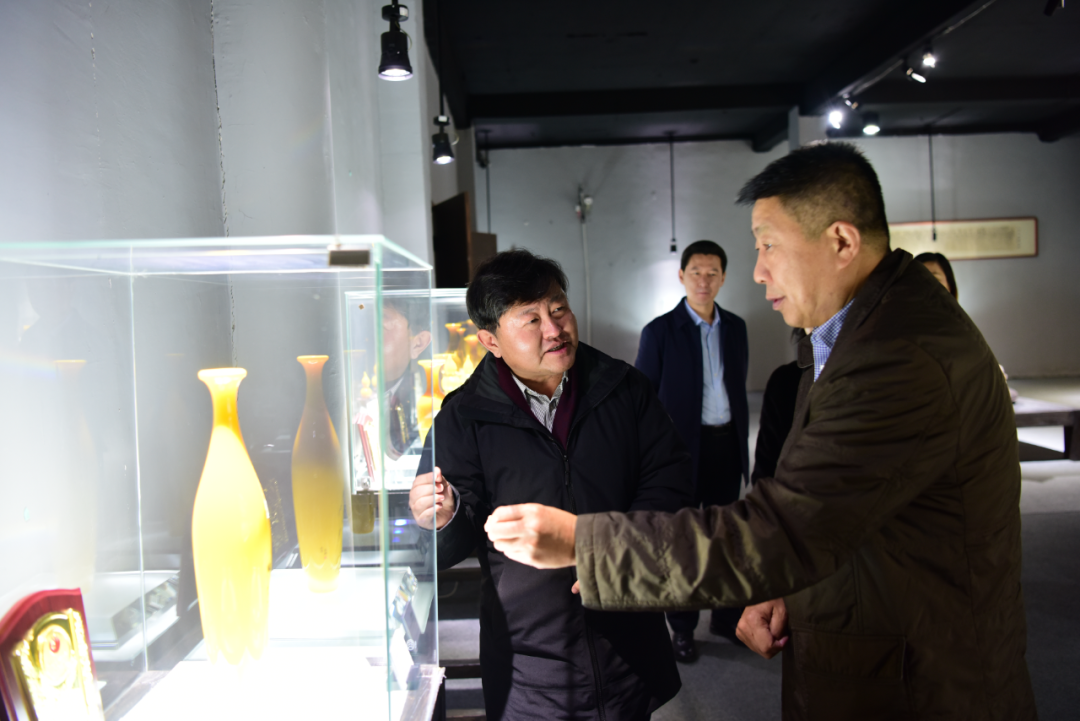 在康乾琉璃博物馆调研过程中,山东省工艺美术大师孙云毅向才大颖理事长一行介绍了他在鸡油黄琉璃作品的探索历程,他在釉料研究、科技创新方面所作的探索非常值得工艺美术行业同仁共同学习。