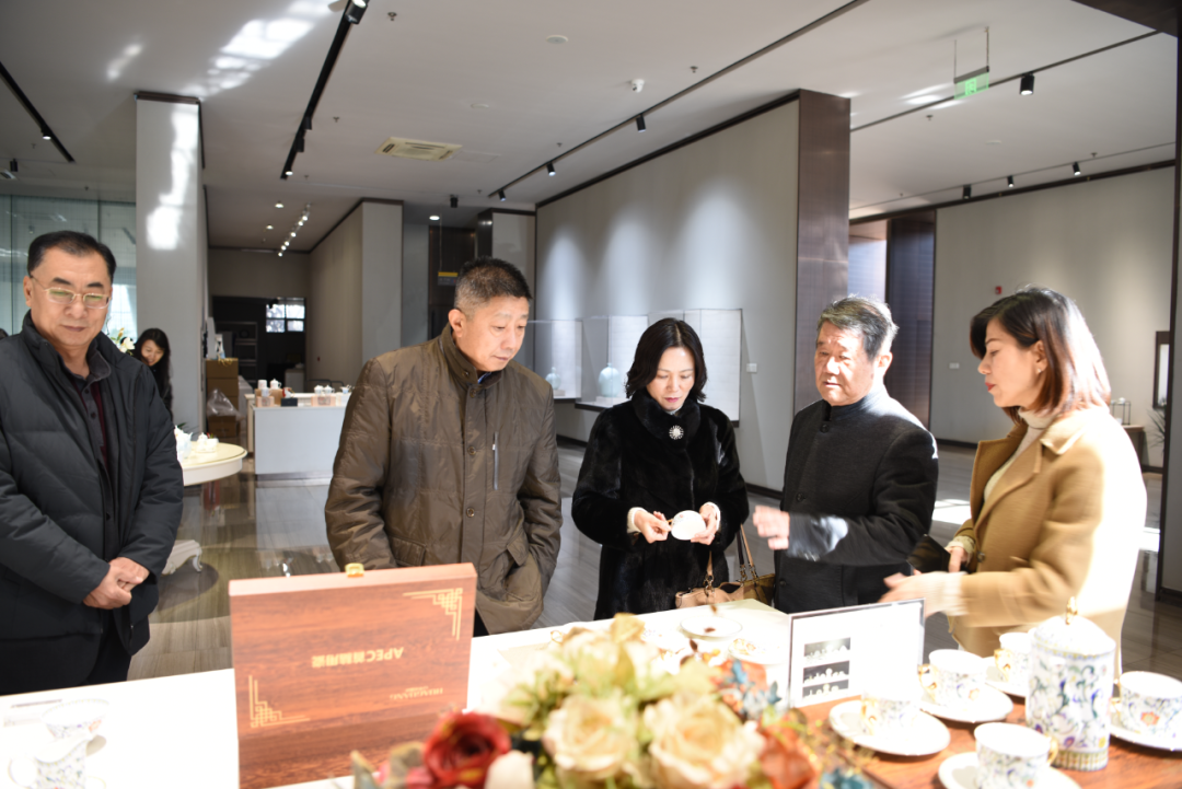 在调研淄博华光陶瓷有限公司的过程中,才理事长认真的观看了华光陶瓷的展厅并与华光陶瓷董事长苏同强、设计总监何岩、副总经理毕庆亮等进行了充分的沟通,围绕华光的品牌定位进行了充分的讨论,并形成了共识。中国工艺美术大师王孝诚工作室
