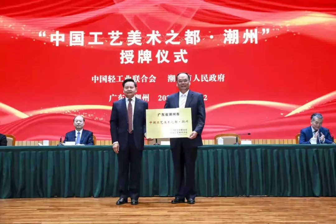大会为“中国工艺美术之都·潮州”举行授牌仪式。张崇和会长授牌,林少明副市长接牌。今年1月,中国轻工联与中国工美协组织专家组对潮州进行了再次复评,根据复评结果,中国轻工联会长办公会研究决定,继续授予潮州市“中国工艺美术之都·潮州”称号。