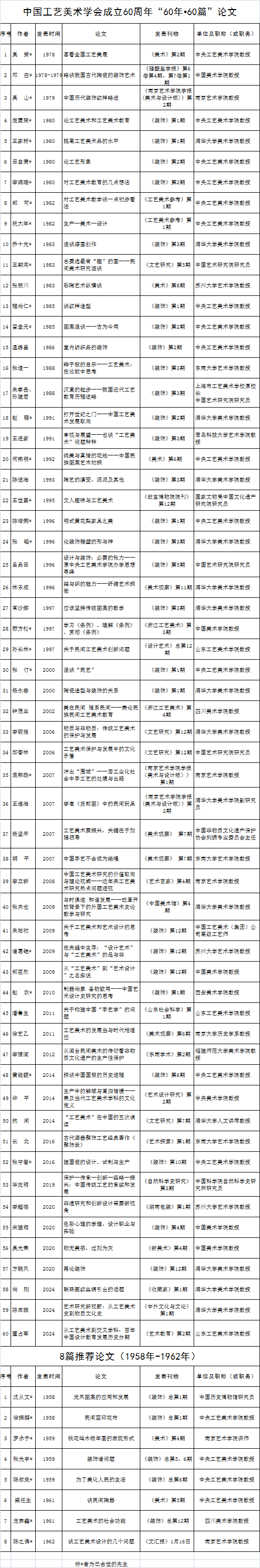 二、鉴于1965年-1977年特殊历史原因未发现可推荐的论文。经评议组核议,特别推荐1965年前发表的8篇具有代表性的论文,以“60+8”篇的形式梳理出近七十年来我国工艺美术理论研究的学脉。