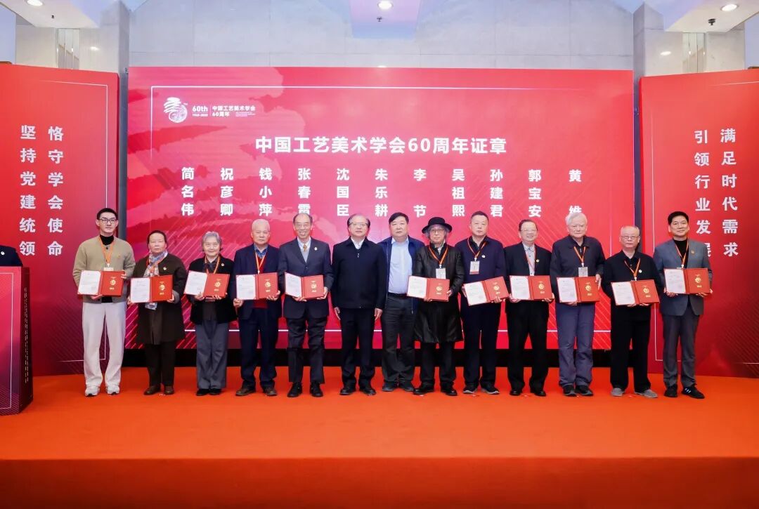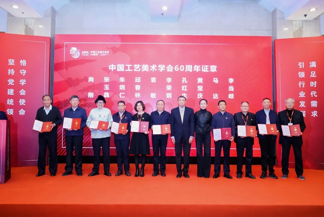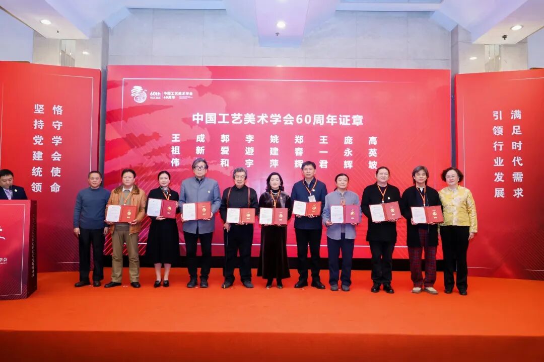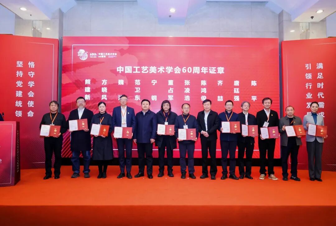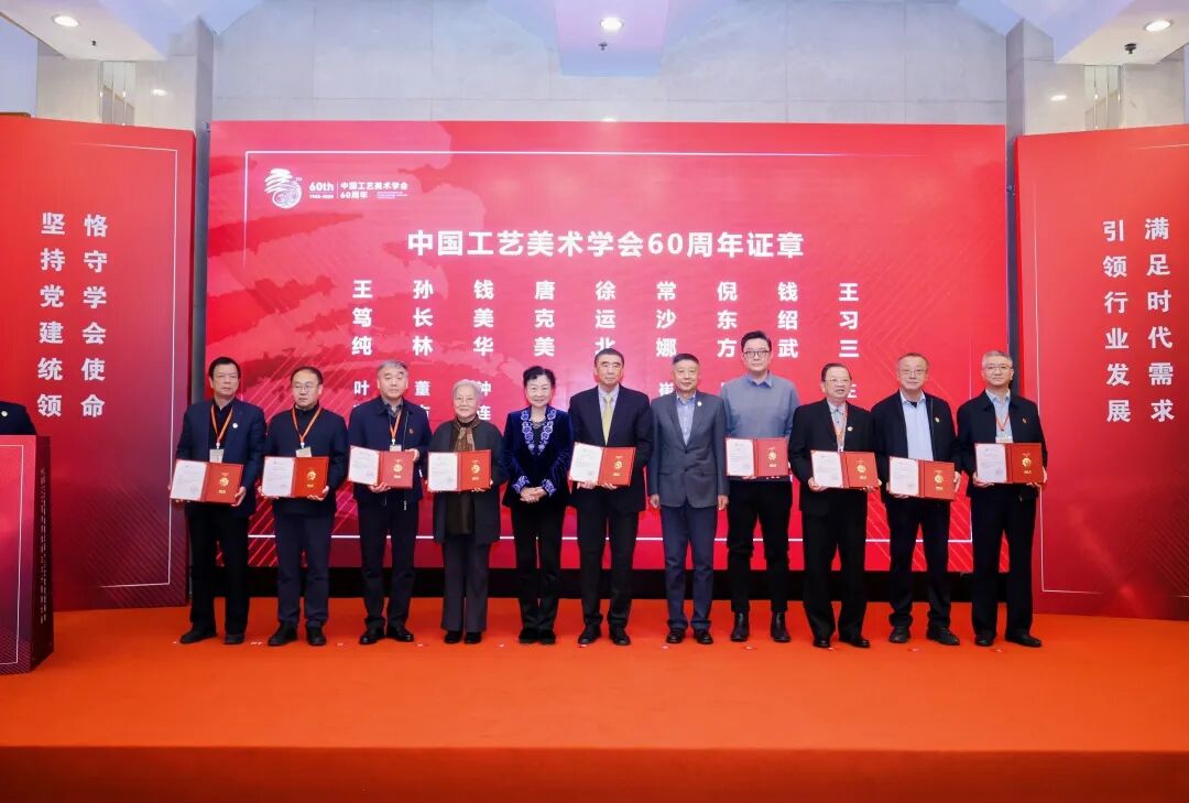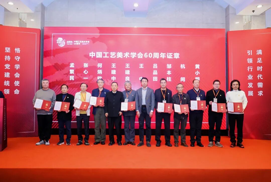 中国美术馆馆长潘义奎为“中国工艺美术学会成立60周年”证章获得者,山东工艺美术学院校长董占军,南京艺术学院院长张凌浩,景德镇陶瓷大学原校长宁钢,湖南工艺美术职业学院党委书记陈鸿俊,苏州工艺美术职业学院党委书记范卫东,广州美术学院工艺美术学院院长齐喆,江南大学设计学院院长魏洁,上海工艺美术职业学院手工艺学院院长唐廷强,《装饰》杂志主编、清华大学美术学院方晓风,暨南大学文化遗产创意产业研究院院长陈平,南昌航空大学艺术与设计学院院长熊建新颁发证章。中国拍卖行业协会会长王波陪同颁发证章。