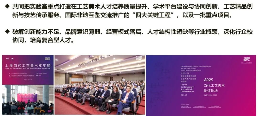 实验室聚焦“工艺传统传承与当代创新”、“跨学科融合与应用”、“社会服务与国际交流”三大实践领域,努力在新时代背景下,以传统工艺为基础,以创新设计为动力,以文化传承为核心,以国际视野为拓展,推动工艺美术的理论研究与实践探索,为工艺美术的发展提供新的思路和方法,面向全球生动展现中国工艺美术的独特魅力和时代价值。