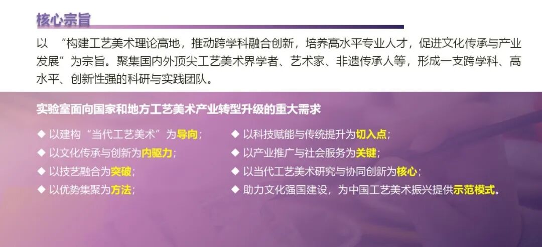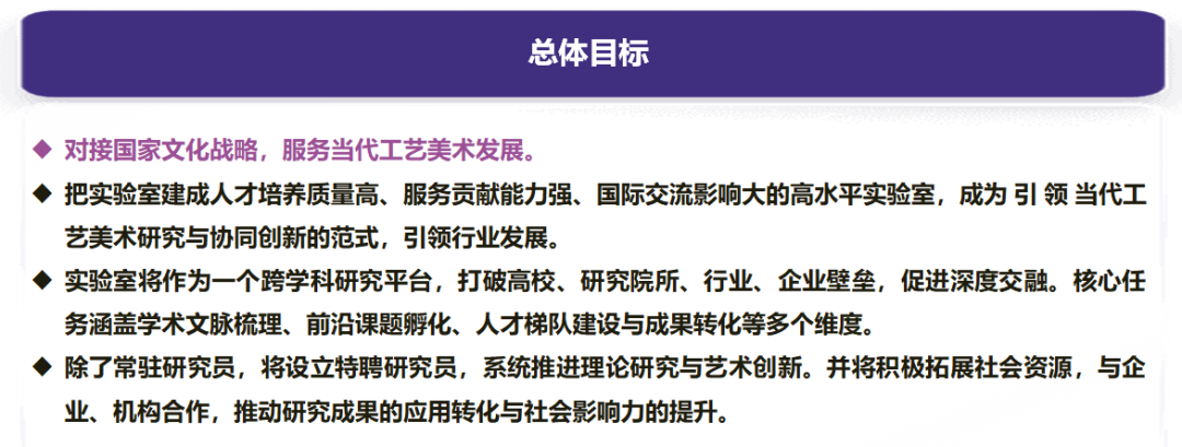 实验室面向国家和地方工艺美术产业转型升级的重大需求,以建构“当代工艺美术”为导向,以文化传承与创新为内驱力,以技艺融合为突破,以优势集聚为方法,以科技赋能与传统提升为切入点,以产业推广与社会服务为关键,以当代工艺美术研究与协同创新为核心,助力文化强国建设,为中国工艺美术振兴提供示范模式。