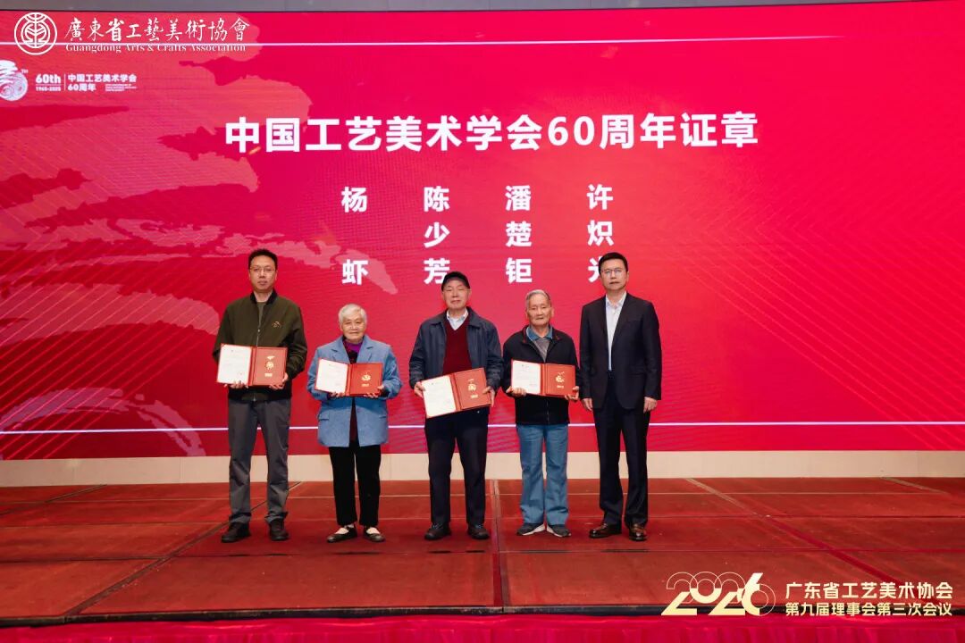 中国工艺美术学会向依然奋战在工艺美术战线的“中国工艺美术终身成就奖”获得者中国工艺美术大师潘楚钜、陈少芳,国家级非物质文化遗产项目粤绣(广绣)代表性传承人、广东省工艺美术大师许炽光,国家级非物质文化遗产项目家具制作技艺(广式硬木家具制作技艺)代表性传承人杨虾颁发中国工艺美术学会60周年“致礼”主题证章”。