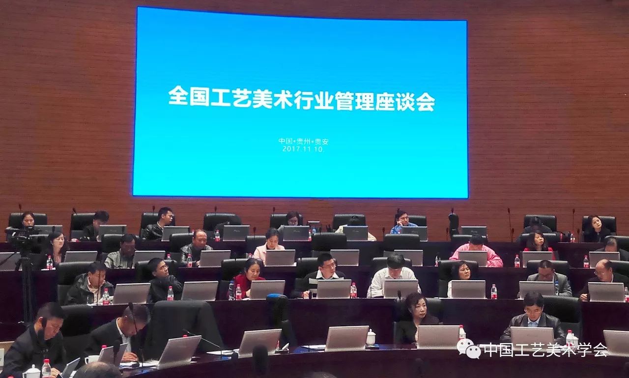 2017年11月10日,由工业和信息化部主办的2017年全国工艺美术行业管理座谈会在贵州省贵安新区隆重召开,会议由工信部消费品司高延敏司长主持,中国轻工业联合会副会长何烨、工信部消费品司、人事教育司、办公厅、规划司有关处室负责同志,36个省、自治区、直辖市、计划单列市工信主管部门负责同志,中国工艺美术学会、中国工艺美术协会、工信部工业文化发展中心负责人,15位国家级工艺美术大师,贵州省贵安新区管委会工信部门负责人以及贵州省工艺美术大师、工美企业负责人共180余人参加了座谈会。