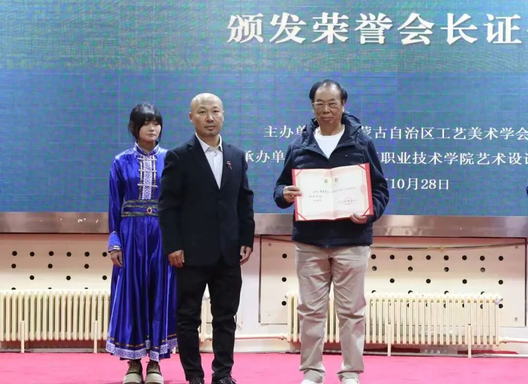 内蒙古自治区工艺美术学会会长、包头轻工职业技术学院艺术设计系教师布日古德为中国工艺美术大师 潘德月发放名誉会长聘书。