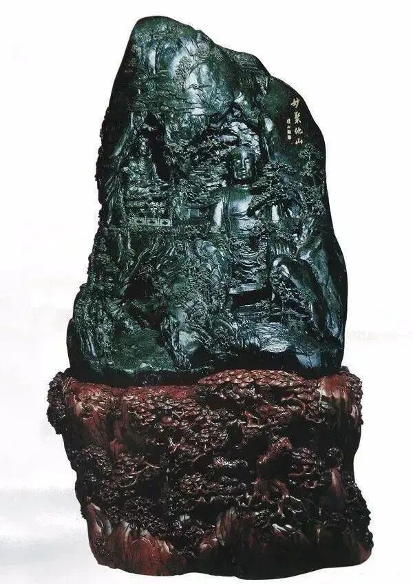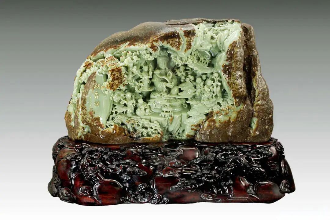 顾永骏大师创作了诸多不朽的艺术珍品,其代表作品以山子雕为核心,兼具文学意境与工艺创新。1986年创作的碧玉山子雕《聚珍图》堪称里程碑式作品,该作以乐山大佛、龙门石窟等四大石刻为蓝本,采用中国山水画的“三远法”构图,汇聚十四尊小佛、二十六位游客及亭台花木,气魄雄伟宏大,获中国工艺美术百花奖金杯奖并被中国工艺美术馆收藏,赵朴初题字“妙聚他山”,被誉为“乾隆后二百年仅见的玉器珍品”。2002年白玉《潮音洞》获首届中国玉雕“天工奖”金奖,2003年白玉《汉柏图》再夺“天工奖”金奖,后者以苏州古柏为原型,通过虚实结合手法展现文人意趣,突破传统山子雕风格。此外,翡翠山子雕《竹林七贤》(2008年)获“百花玉缘杯”金奖。