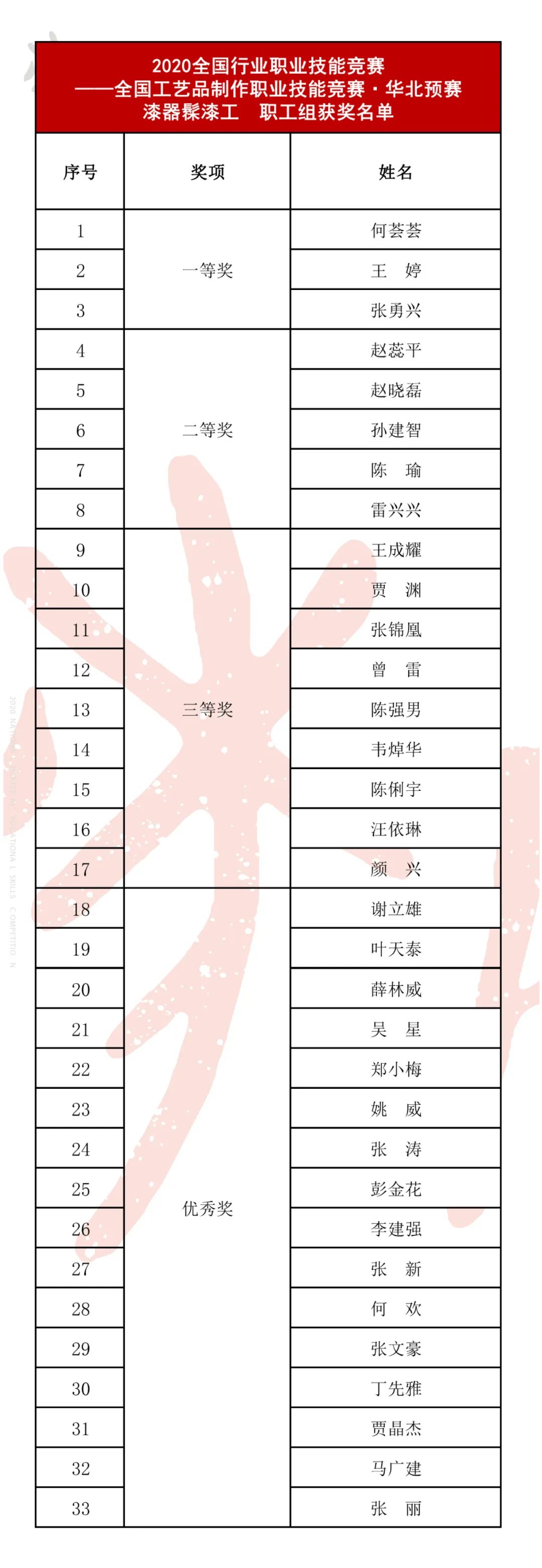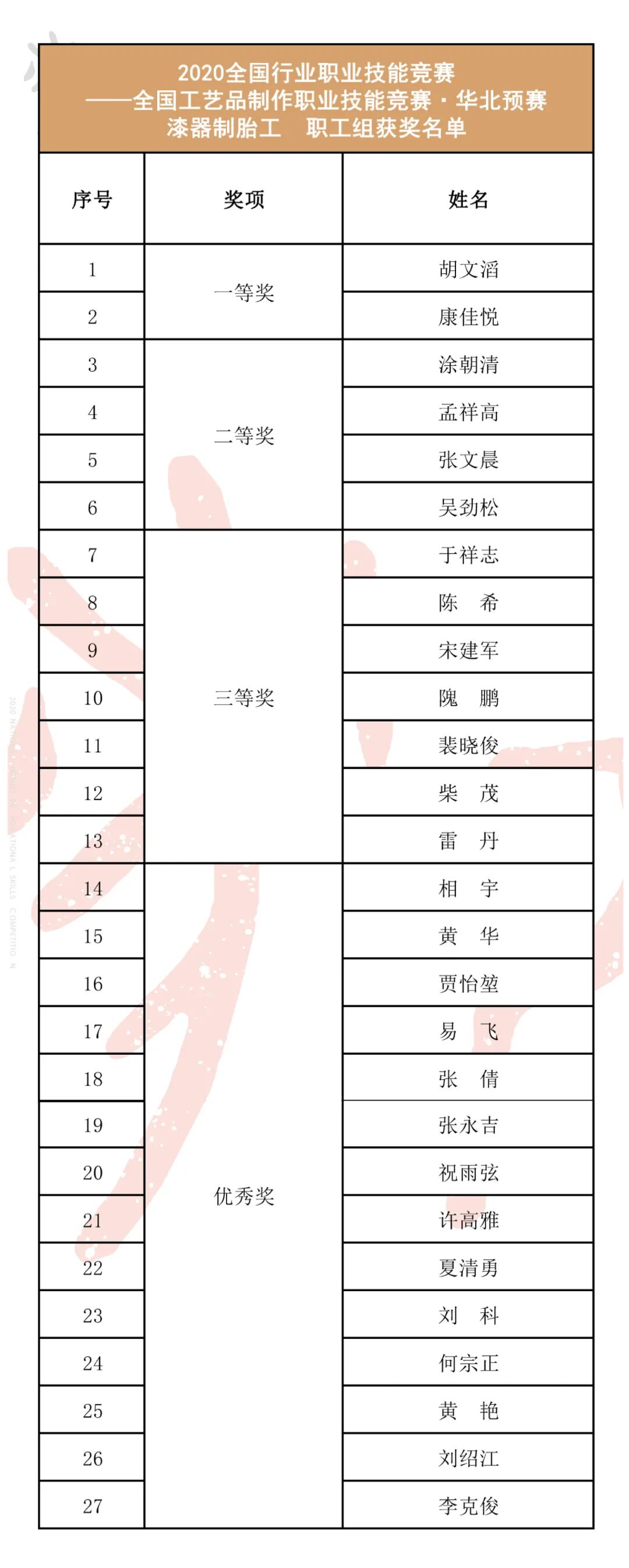 截至目前,2020全国工艺品制作(漆器制胎工、漆器髹漆工)职业技能竞赛·全国预选赛已圆满完成;总决赛将于11月20日-11月23日在湖北荆州举办,欢迎大家持续关注!