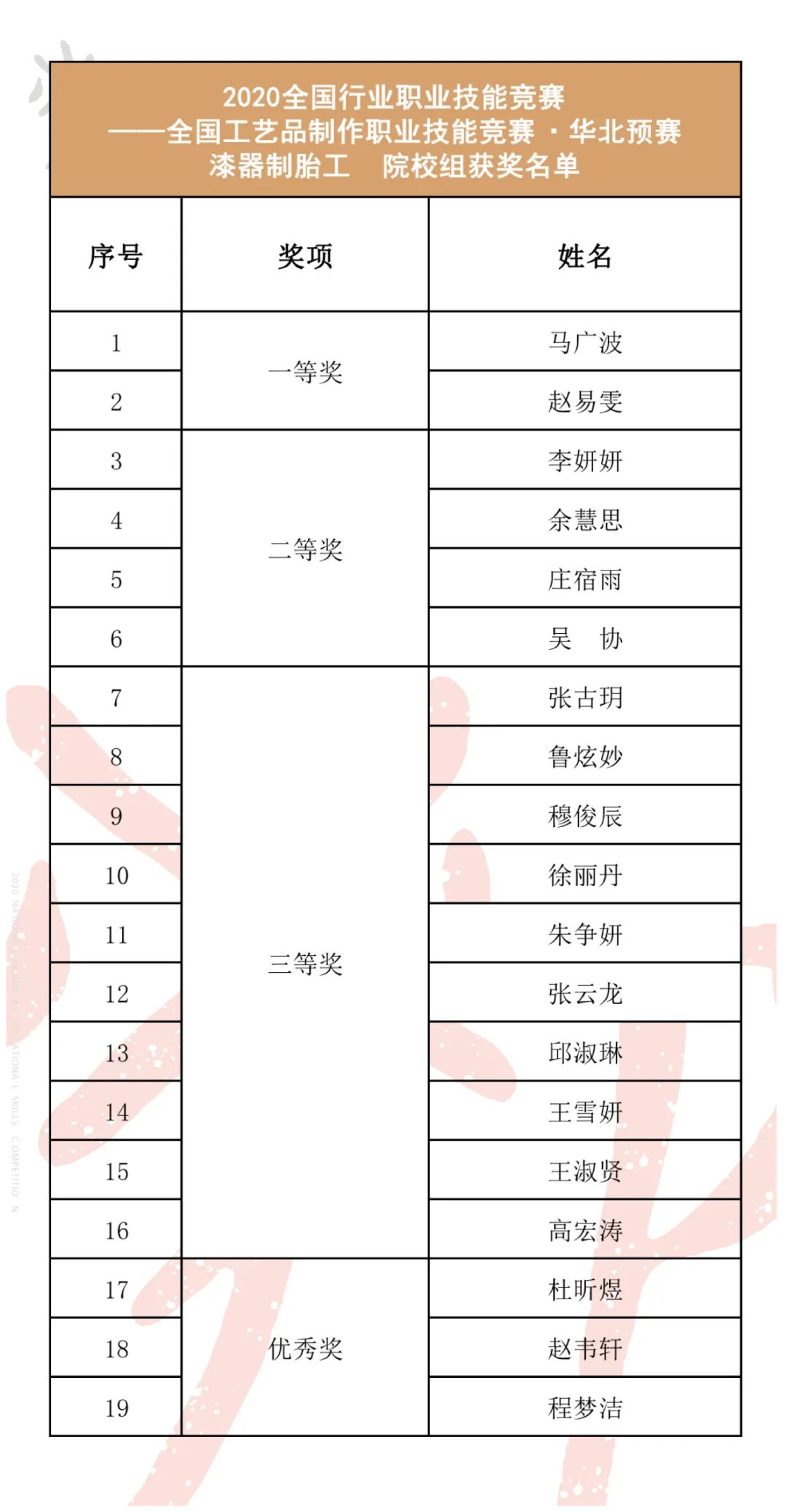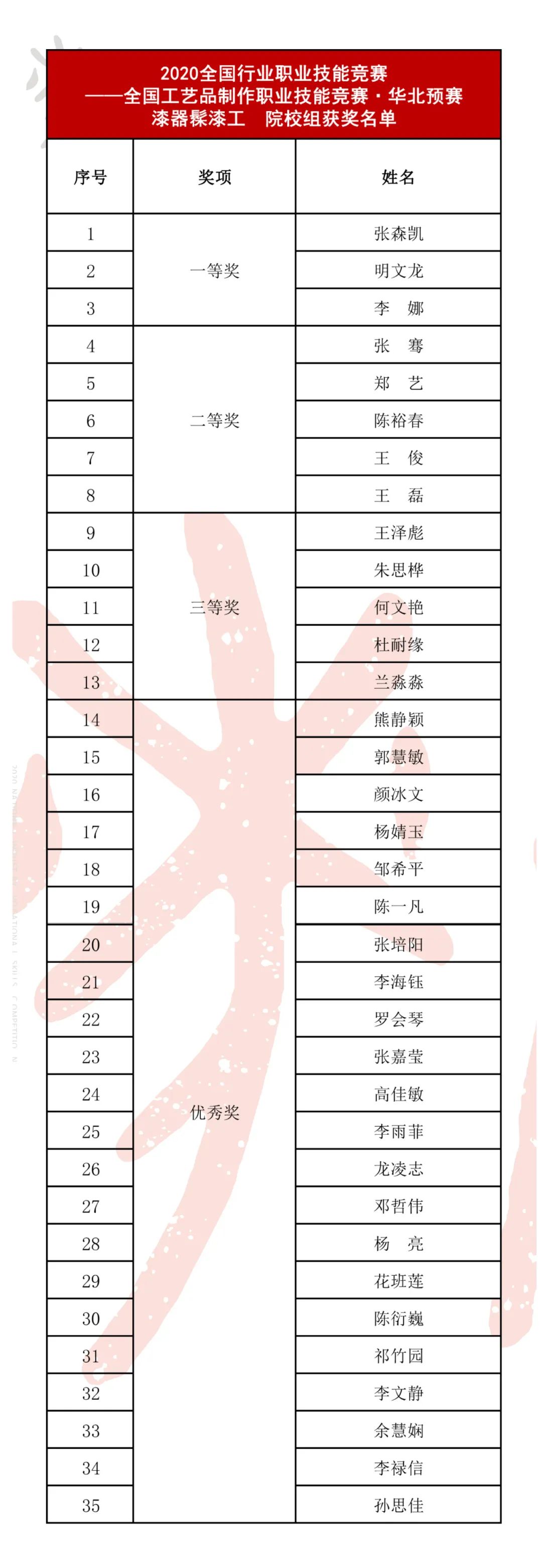 漆器制胎工(职工组、院校组)获奖名单