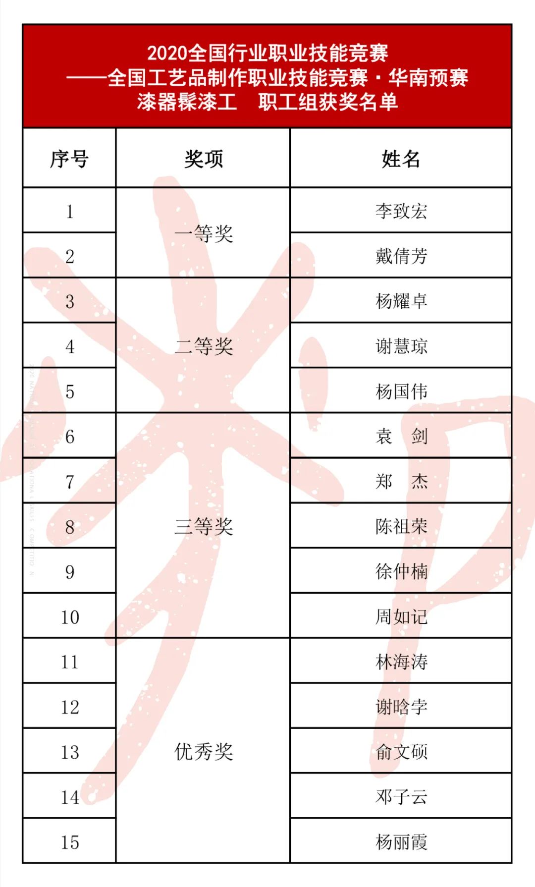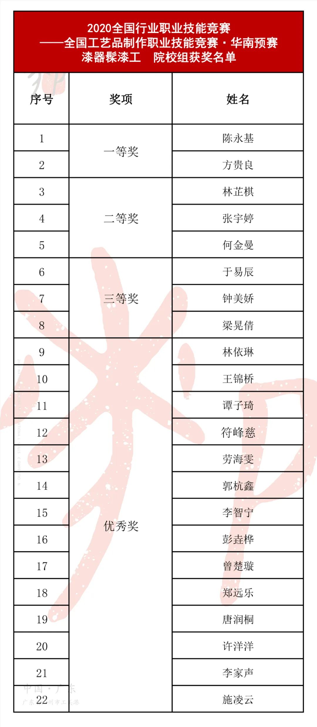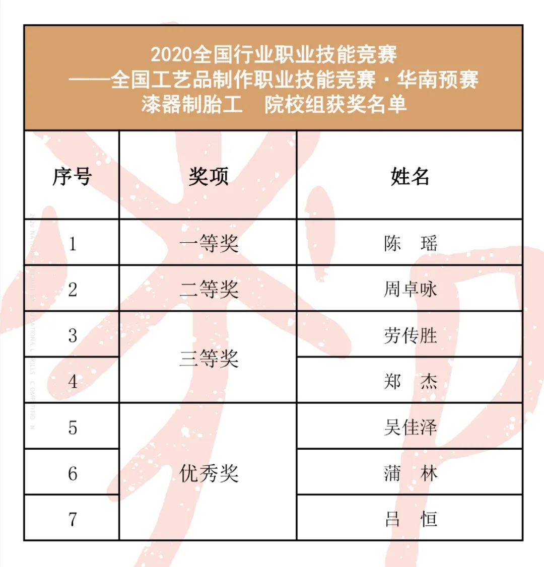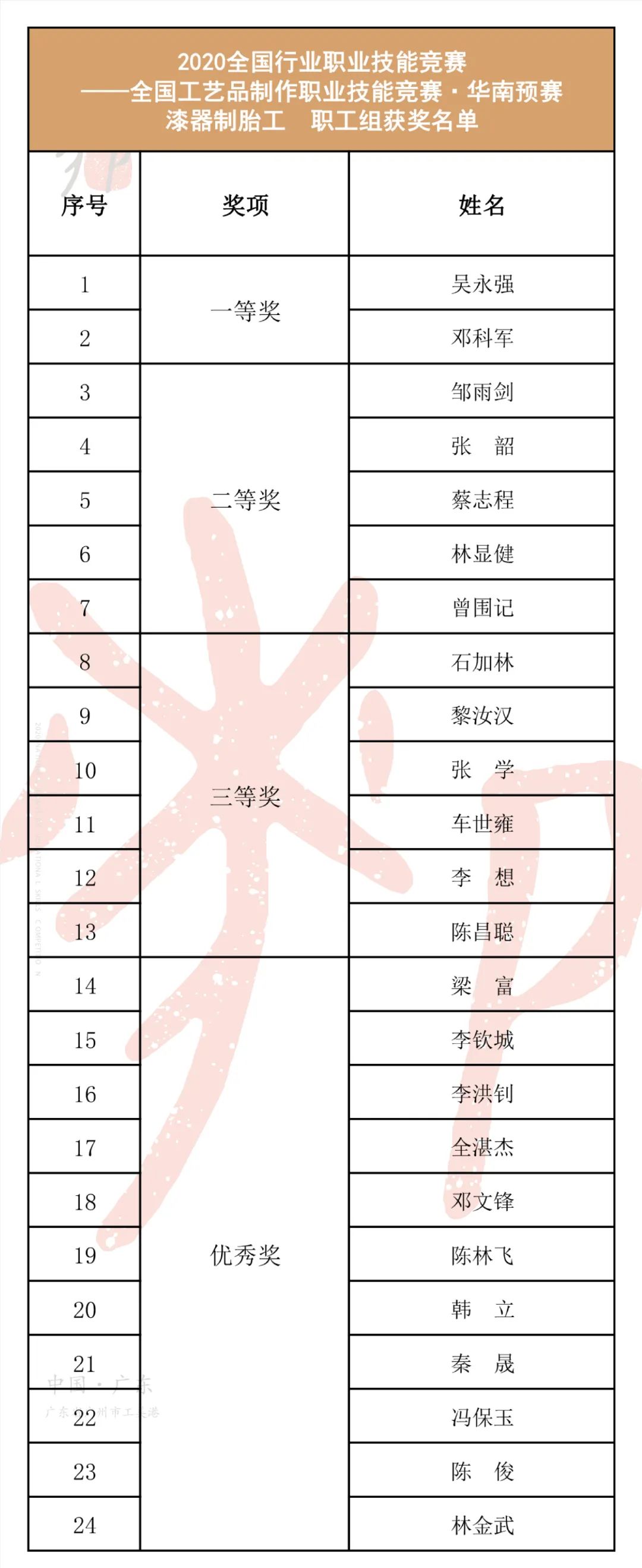 漆器髹漆工(职工组、院校组) 获奖名单*漆器制胎工(职工组)、漆器髹漆工(职工组、院校组),获得第一、二、三等奖的选手可入选全国总决赛。漆器制胎工(院校组)获得第一、二、三、优秀奖的选手可入选全国总决赛。