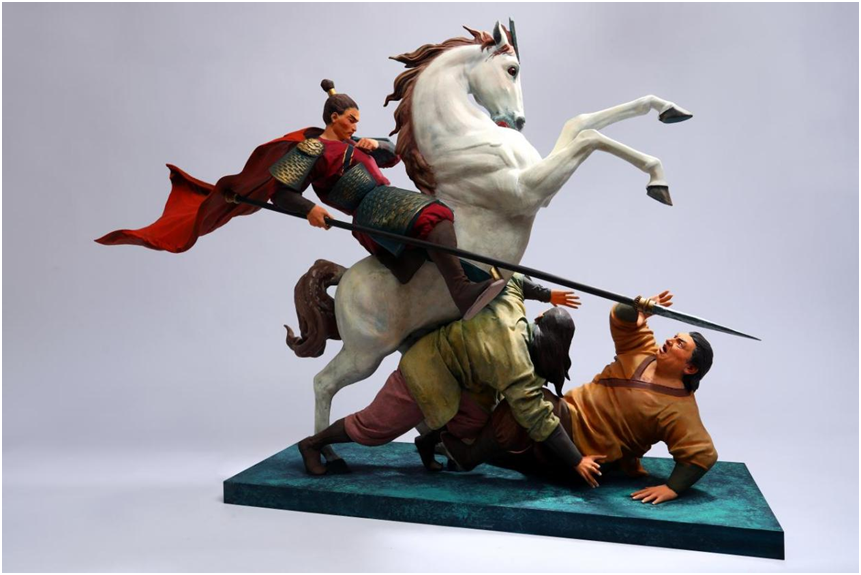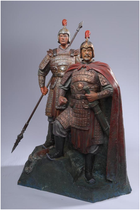 创作理念:作品以“卫霍镇疆”为核心主题,采用三角形构图,卫青雄踞于前方,霍去病挺立在后方,手持长矛,其在视觉层面呈现出稳固感,与二人作为大汉边疆稳固支柱的崇高地位相契合。作品生动还原了西汉札甲的风貌,卫青沉稳若山,展现出统帅的威严仪态;霍去病锐挺似松,展现出战神的凌厉锋芒,体现了大汉尚武精神。