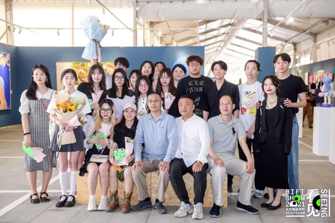 北服美术学院院长关立新(前排中)、党委书记刘疆(前排右一)、副院长马天羽(前排右二)与部分毕业生合影