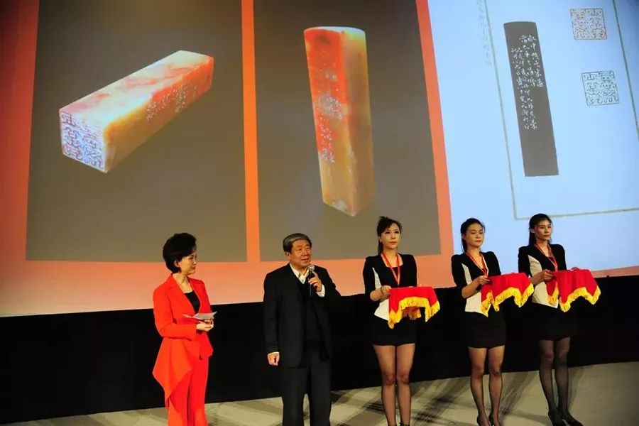 为庆贺此次四大国石雕刻艺术展的成功举办,更是为了向祖国70周年华诞献礼,中国安华集团巴林右旗巴林石矿业有限公司精选了三枚极品鸡血石章料,邀请我国著名书法家、篆刻家韩天衡先生创作了三方印章,同时邀请国家文物局原副局长张柏先生与大家共同见证这三件作品:第一方,印文为“文化自信”,边款,为伟大复兴的中国梦提供精神动力和文化保障。第二方,印文为“不忘初心”,边款,坚持以人民为中心,充分体现为人民服务根本宗旨。第三方,印文为“大展宏图”,边款,启中兴之宏图,当太平之昌历。意为开启国家伟大复兴,定下走向太平盛世的时间表!
