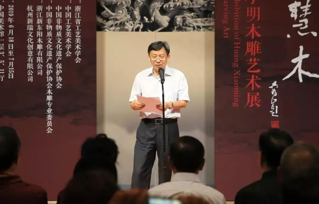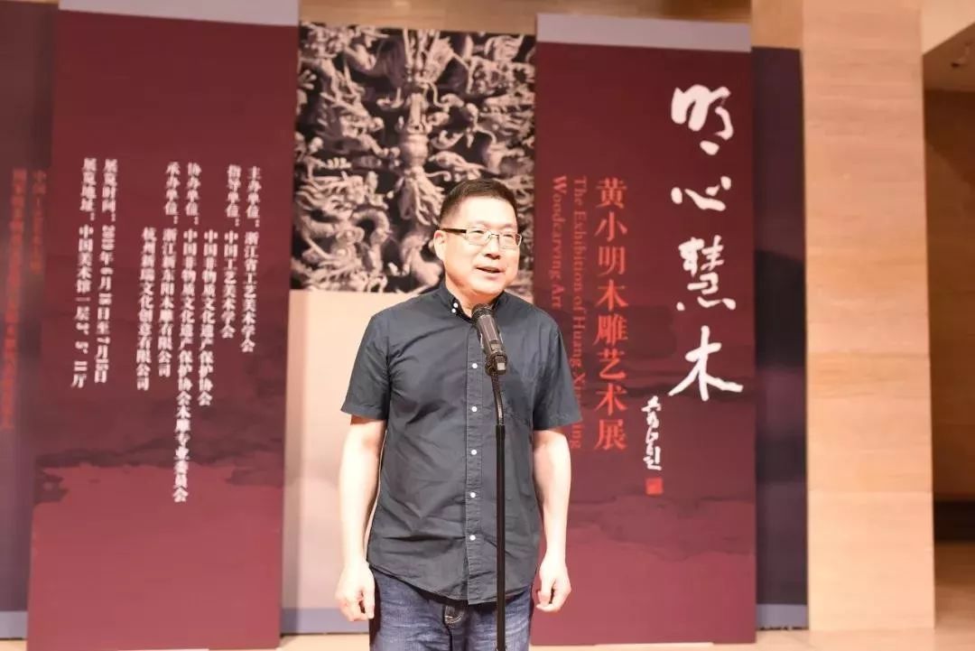 中国美术学院副院长杭间教授在致辞中说:很高兴再次来到北京参加黄小明老师的个人艺术展。黄小明老师是中国工艺美术界的中青年一代的杰出代表,是最富有开拓性的艺术家,东阳木雕过去主要是用于建筑装饰,在陆光正等几代大师的努力和贡献下,形成了在全国各类木雕中最繁荣最富生命力的形态。现在,在黄小明老师进一步的拓展下,又有了新意。黄小明老师不仅在艺术上勇于探索精益求精,同时,对非遗的传承保护、对产业的发展、对新一代人才的培育,其贡献是全方位的。我从黄小明老师身上看到的是中国工艺美术大师中青年最有潜力、最有生气的代表,他是中国木雕艺术的代表人物。木雕在中国已经糅合了当代艺术形态、现代空间艺术形态,现在,在黄小明老师团队的努力下,有了更丰富的表现技法,这些在传承和发展中所创作的作品,成为中国木雕非常重要的成果。借这次展览机会,也向全社会展现了传统工艺在当代新的发展,展现了浙江省工艺美术新的发展。这样的发展,必定对繁荣中国新时代的文化,对传统文化的推陈出新,都有着非常重要的借鉴意义。