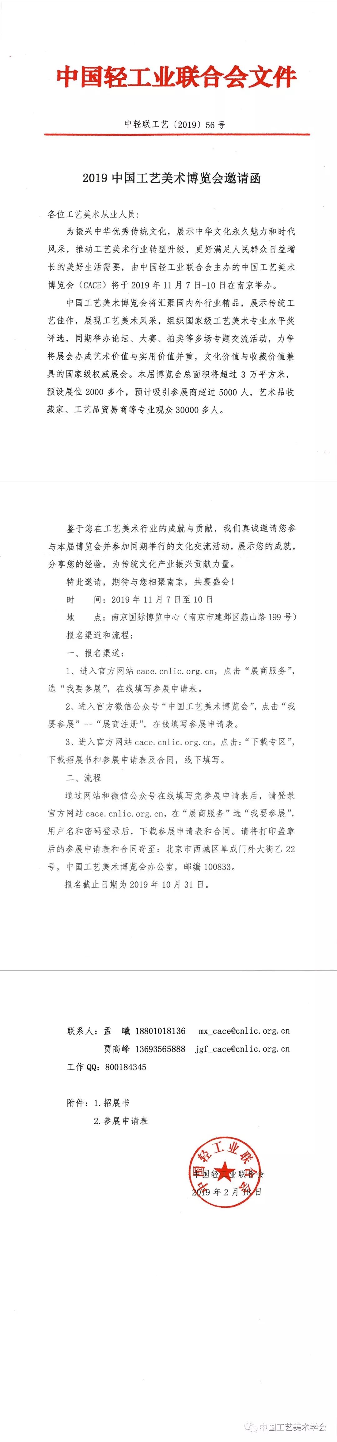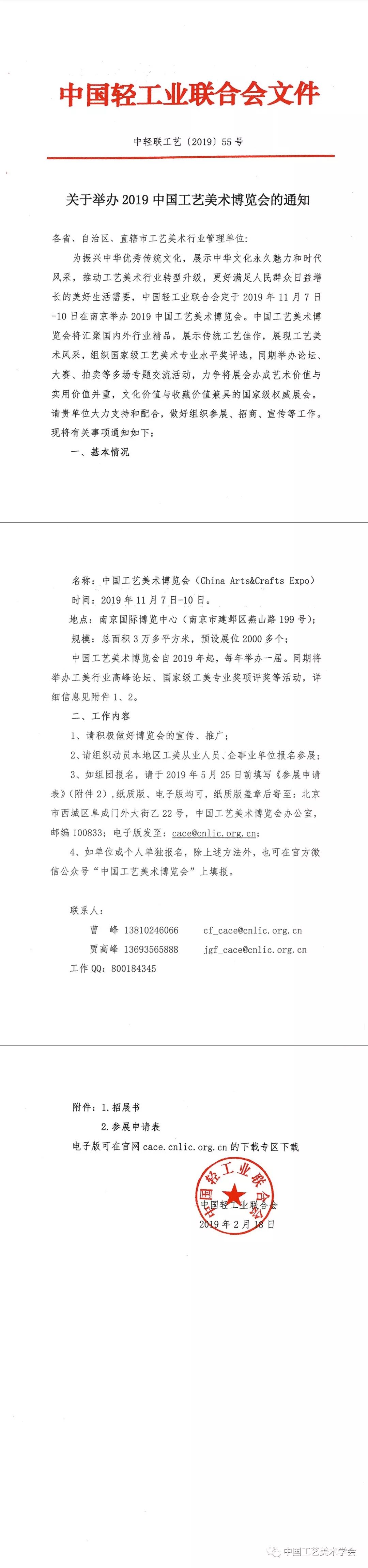 由中国轻工业联合会主办的中国工艺美术博览会将于2019年11月7日至10日在南京国际博览中心举办,招展书和参展申请表请于官方网站下载。