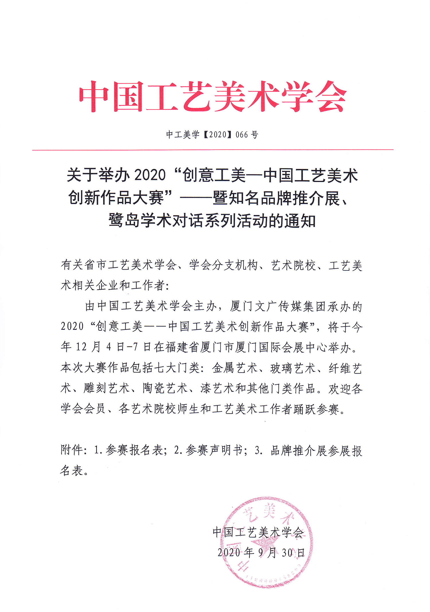 关于举办2020“创意工美—中国工艺美术创新作品大赛”——暨知名品牌推介展、鹭岛学术对话系列活动的通知